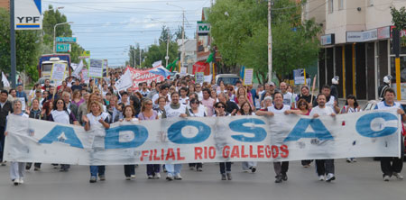En Río Gallegos los docentes se congregaron en el Colegio Ladvocat en el centro de la ciudad y de allí, alrededor de las 11:30 comenzaron a marchar por distintas arterias céntricas parando frente al Consejo Provincial de Educación (CPE) en la ex calle Roca, donde se manifestaron en contra de las autoridades educativas, prosiguieron hacia la Subsecretaría de Trabajo, por entender que el Secretario Santibañez no cumple con la tarea de mediador en el conflicto, sino que es una herramienta más de apriete a los docentes y de allí la columna, integrada por unos 600 maestros, se dirigió hacia casa de gobierno.