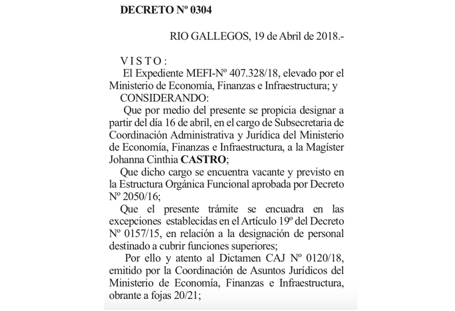 Por Decreto 0304 del 19/04/18 Johanna Cinthia Castro fue nombrada por el gobierno de Santa Cruz en la Subsecretaría de Coordinación Económica y financiera, lo cual fue publicado en el Boletin Oficial Nº 5248 de fecha 08 de mayo del corriente año.