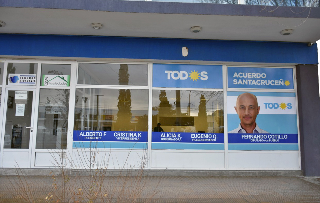 Llamativamente en el local que el kirchnerismo del ala “oficialista” abrió en calle Independencia al 500 de la ciudad de El Gorosito, la Unidad Básica puesta por el ex intendente Fernando Cotillo, ex intendente de esa ciudad y actual Presidente de Distrigas SA, desde que Alicia Kirchner asumió en la provincia, posee en su frente lugar para tres gigantografías de los candidatos: la de “Fernández-Fernández”, Alicia Kirchner-Eugenio Quiroga su candidato a vice y la de Fernando Cotillo, candidato a Diputado por el Pueblo de Caleta Olivia en la lista “Acuerdo Santacruceño”.
