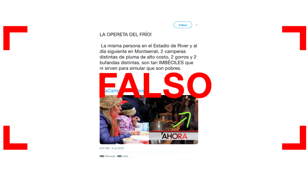 -Fue acusada en redes de simular ser una indigente comiendo en el estadio del Club Atlético River Plate y al otro día en el barrio Montserrat. Esto es falso.