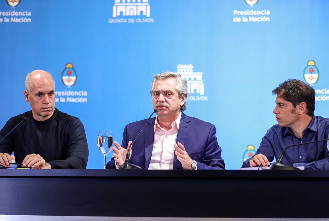 Acompañado por el gobernador bonaerense, Axel Kicillof, y el jefe de Gobierno porteño, Horacio Rodríguez Larreta, el Presidente sostuvo que tampoco “se van a poder desarrollar espectáculos, teatros, cines, deportivos o musicales”.