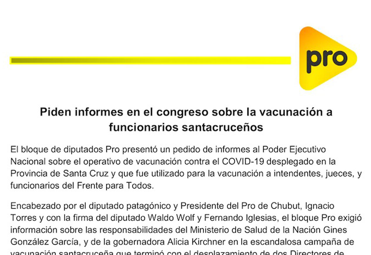 El informe del Pro indica que la presentación la efectuó el presidente del Pro de Chubut, Ignacio Torres y con la firma del diputado Waldo Wolf y Fernando Iglesias, el bloque Pro donde exigen información sobre las responsabilidades del Ministerio de Salud de la Nación Gines González García, y de la gobernadora Alicia Kirchner en el escándalo suscitado en Cdte Luis Piedra Buena y otras localidades de Santa Cruz, con a vacunación Covid.