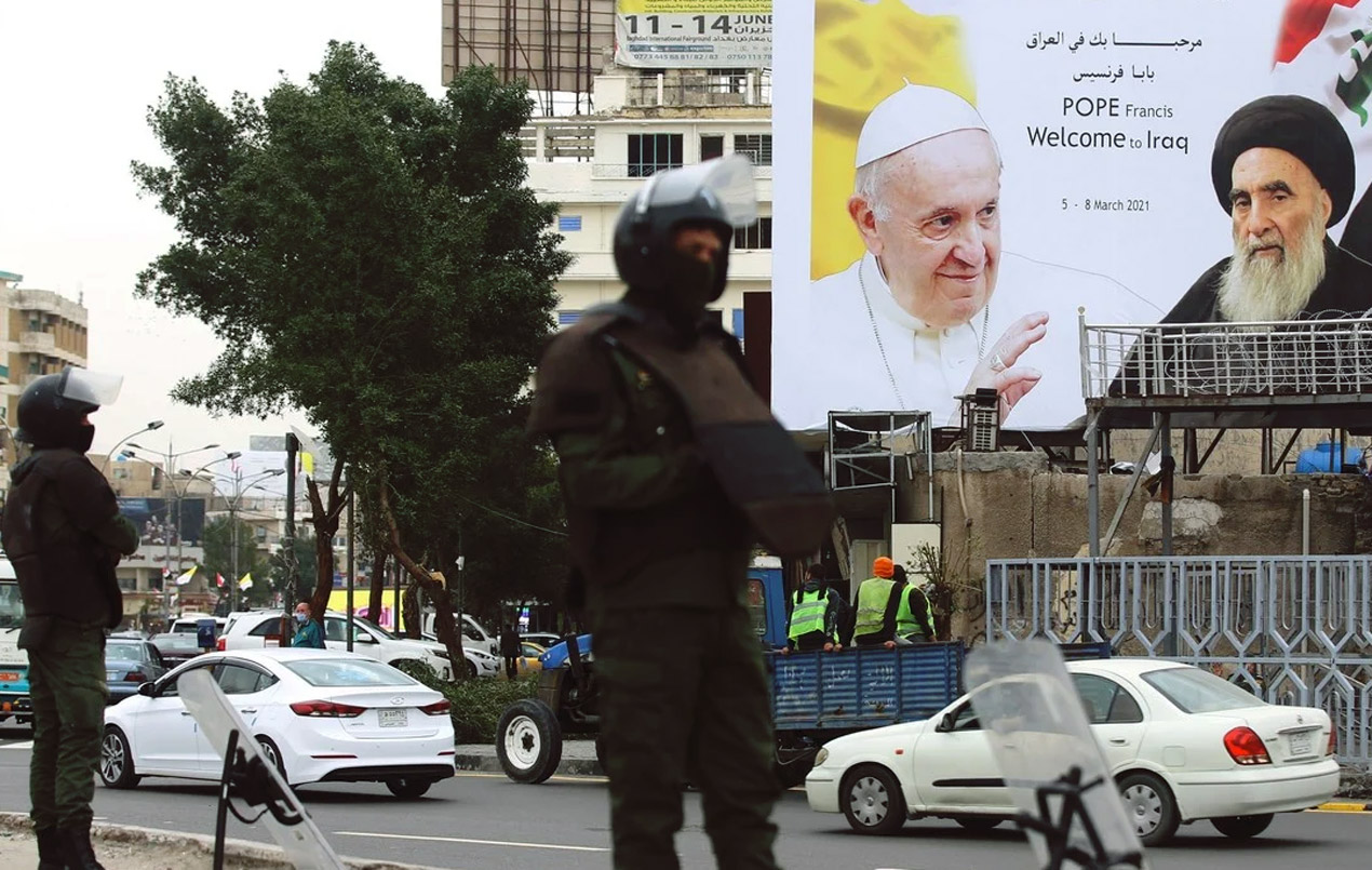 Fue el último acto del Papa en su primer día en Bagdad, ciudad que, debido a la cuarentena impuesta por la epidemia, parecía en guerra. Vestida de fiesta y embanderada para recibir al huésped ilustre, con banderitas del Vaticano e iraquíes, posters que daban la bienvenida a Francisco “a la mesopotamia” y carteles que hablaban de hermandad y paz, pero, en verdad, pertrechada como si estuviera en pleno conflicto bélico.
