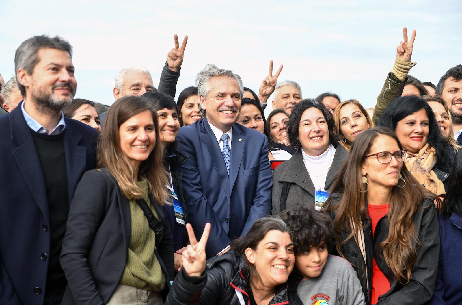Una hora y media después de lo previsto (el público mayoritariamente de pecheras acomodaba banderas en cañas, almorzaba en un oportuno food truck de la militancia y calentaba instrumentos, parches y trompetas), Fernández y algunos ministros (Santiago Cafiero, Daniel Scioli, Carla Vizzotti, Matías Lammens, Elizabeth Gómez Alcorta, Gabriel Katopodis, Juan Zabaleta), legisladores (Victoria Tolosa Paz, Daniel Gollán, entre otros), funcionarios, intendentes, subieron al escenario.