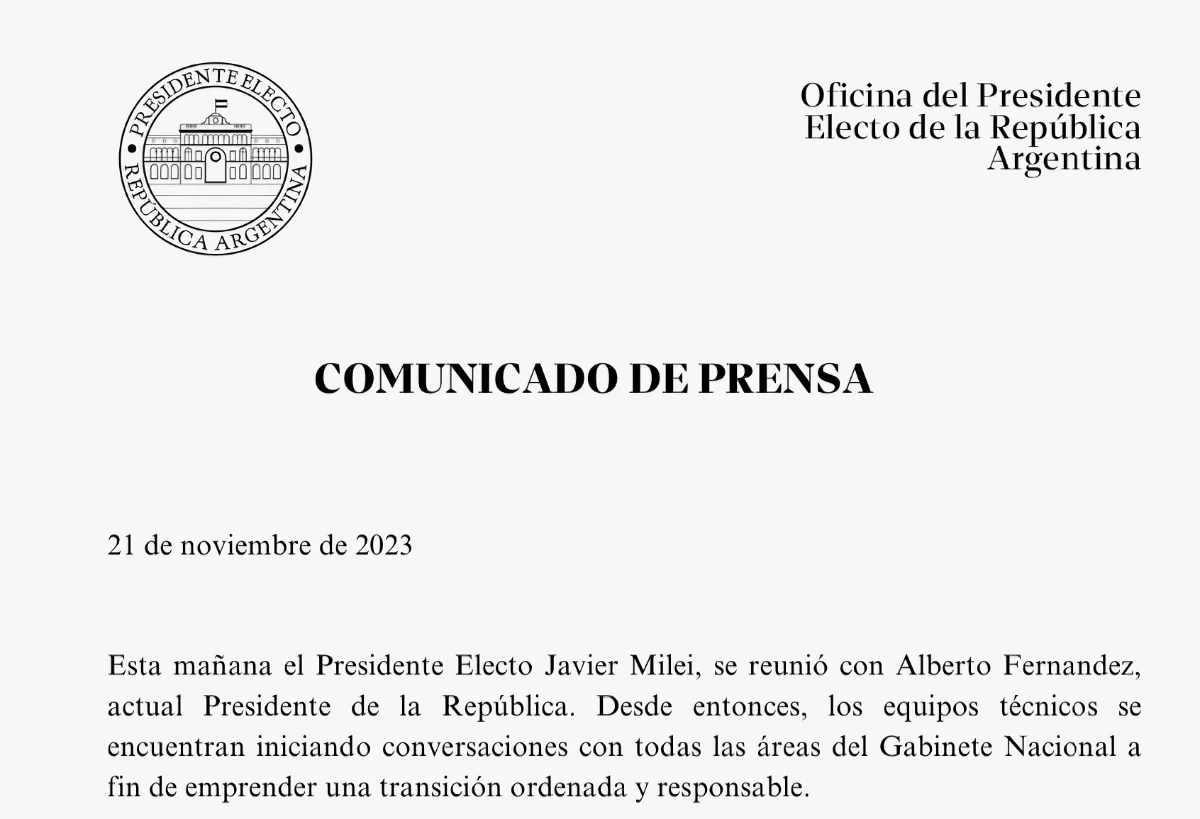 Esta nueva forma de comunicación se inauguró este martes y fue utilizada para disipar dudas sobre la reunión sostenida con el presidente Alberto Fernández en la misma jornada. Además, se aclaró que los nombres de los integrantes del futuro Gabinete nacional de Milei se darán a conocer el 10 de diciembre, después de la asunción presidencial. (Agencia OPI Santa Cruz) Con información de NA