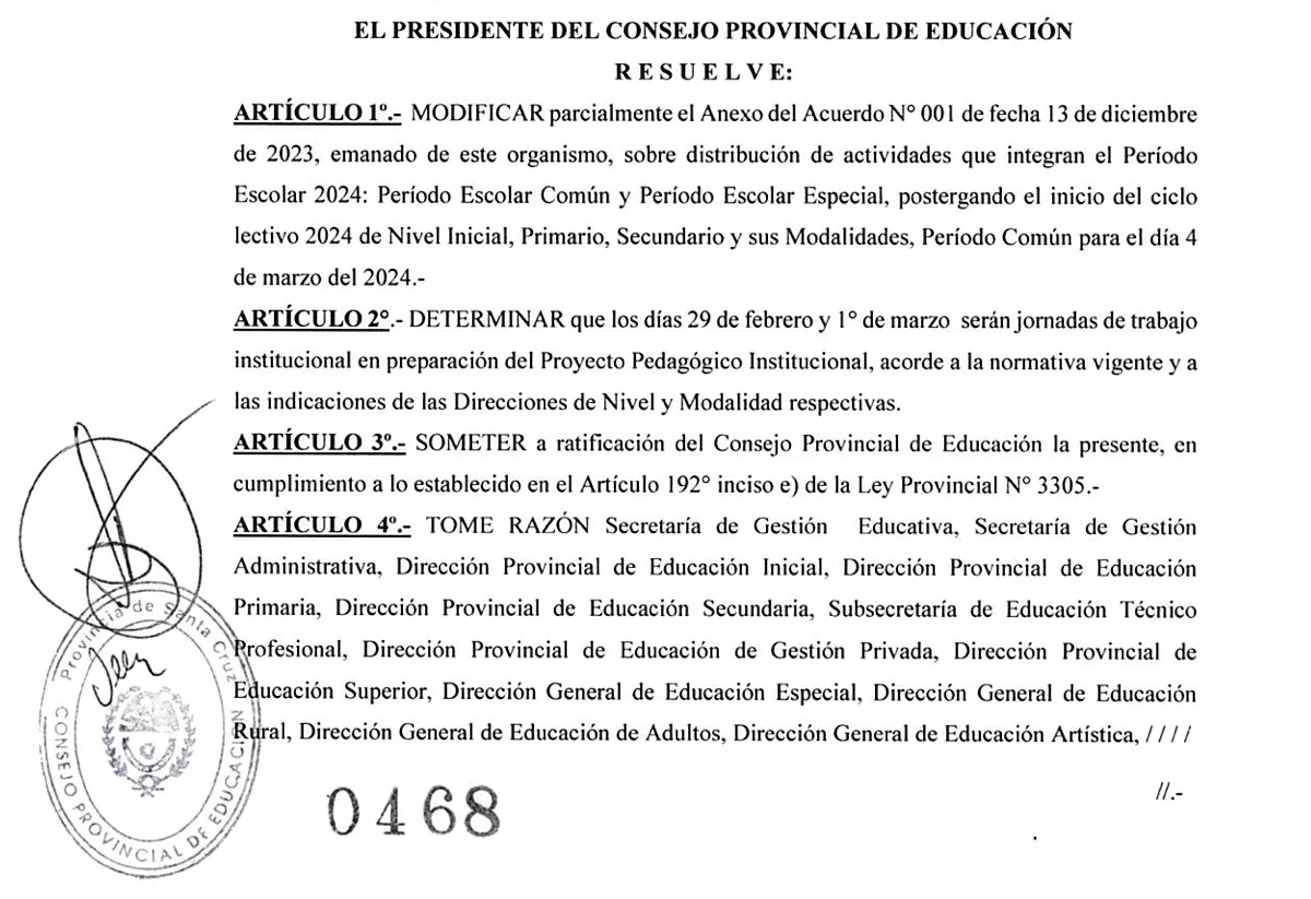 Imprevistamente, luego de que su último ofrecimiento salarial fuera rechazado por ADOSAC y AMET, dejando en firme el paro de 48 horas para el 29 de febrero y 1º de marzo, el gobierno provincial a última hora del miércoles 28, emitió la Resolución Nº 0468 por la cual determina que el inicio de clases será el día lunes 4 de marzo 2024.