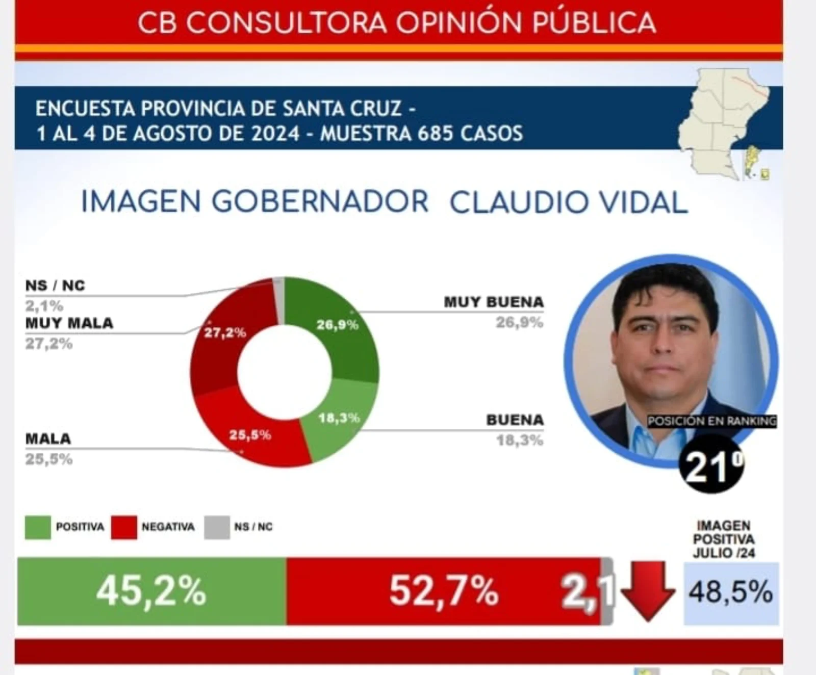 En cuanto a los gobernadores, el de Santa Cruz Claudio Vidal figura en el lugar 21 de 24 y posee una imagen positiva del 45,2% con una negativa de 52,7%. Esto arroja un promedio de imagen positiva de 48,5%.