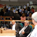 El otro sector de gradas había sido ocupado por unos pocos jubilados y personal empleado de la Cámara que cubrió los espacios libres, con lo cual, ambas gradas quedaban completas y fue precisamente por este motivo que la presidencia con el apoyo de la policía que había formado un cordón en las escaleras de acceso, no permitieron que aproximadamente unas 60 personas entraran al recinto.
