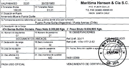 La nave que cargó metal precioso el 14 de enero en Punta Quilla cuenta con certificado de matrícula 2220 emitida el 26/05/80 en Valparaíso (Chile), es un barco pesquero con el numeral C.B. 2976 que desarrolla una velocidad de 9 nudos, dotado de máquinas diesel, cuenta con un calado de proa de 2,40 mts y un calado de popa de 2,50 mts, de acuerdo a los datos declarados por sus armadores.