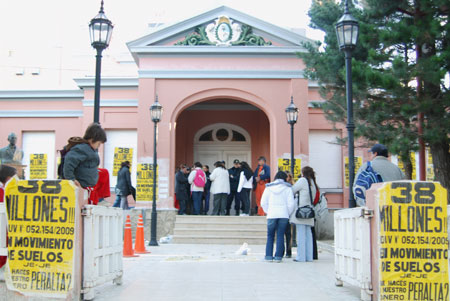 Los manifestantes llegaron hoy al centro de la ciudad, allí realizaron una clase pública en calle Roca y San Martín y desde el lugar se dirigieron a casa de gobierno. Allí realizaron pegatinas de carteles que le reclaman al Gobernador Peralta les de prioridad a sus necesidades y le cuestionan la asignación de 38 millones de pesos para “movimiento de suelos” en el Barrio San Benito, comparando esta cifra con la necesaria para realizar la obra que viene demorada y prometida por el gobierno.