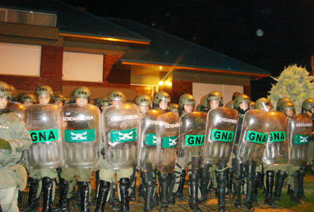 “De allí en más no pudo contarse con directivas del juzgado federal y el operativo derivó en los incidentes ocasionados por los manifestantes con agresiones hacia el personal de gendarmería nacional y policial…” afirma Wilfredo Alejandro Roque, aunque ningún gendarme o policía fue asistido en el hospital local, y sí en cambio se constató que el dirigente Ernesto “Chino” Velazquez (Adosac) sufrió heridas en su cabeza producto de un golpe con la culata de un fusil antigases.