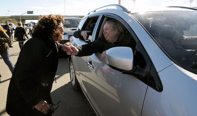 Integrantes de los gremios Camioneros, UPCN, empelados públicos, representantes de otros gremios y vecinos, acompañaron una nutrida caravana cuyo primer auto llegaba a la avenida Balbín y el último pasaba por frente al ingreso al aeropuerto; “Es una caravana como pocas – dijo exaltado uno de los manifestantes con banderas – es para que los diputruchos y los intendentes lo miren por TV”, gritaba, mientras agitaba una enorme bandera.