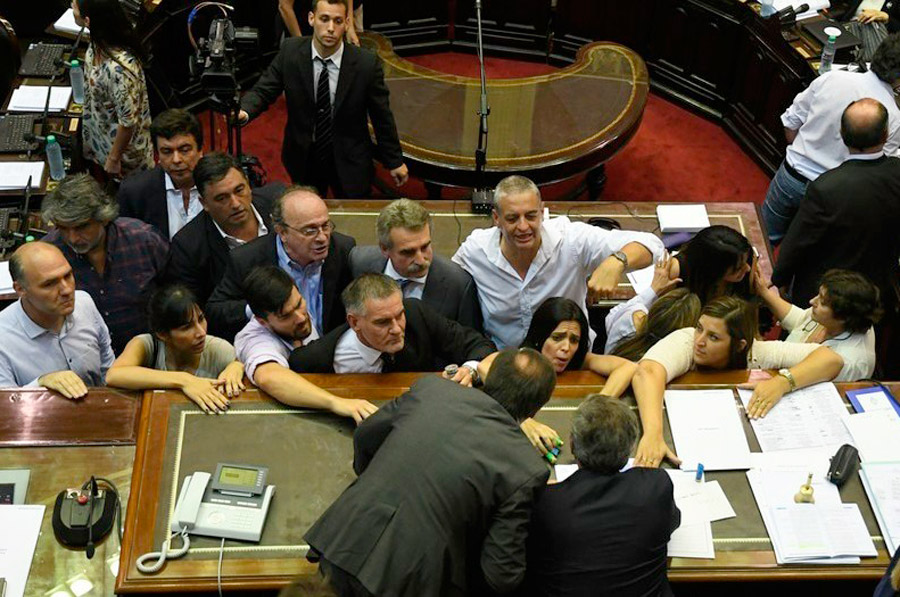 Como último recurso para contener el reclamo, ya propagado a toda el ala derecha del recinto, el presidente de la Cámara le preguntó (casi le imploró) al radical Luis Pastori, en uso de la palabra antes de que comenzara el griterío, si le concedía una interrupción a Agustín Rossi , jefe de la bancada kirchnerista.