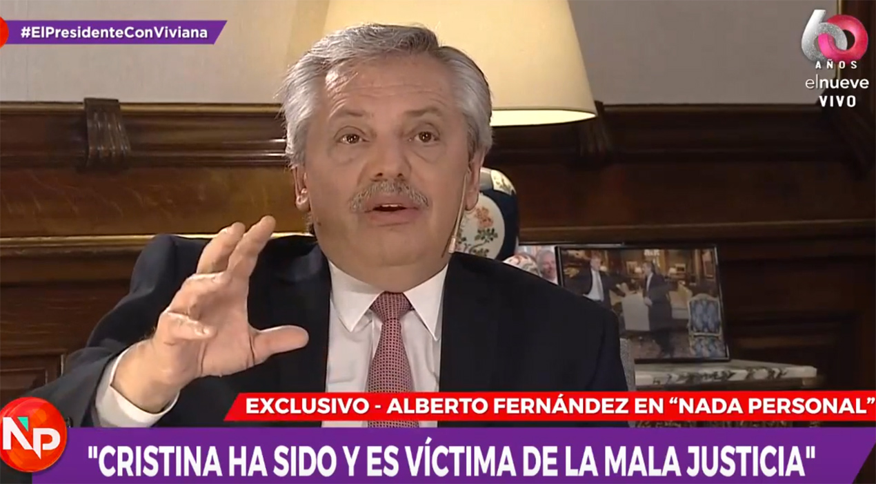 —Cristina fue víctima de mala justicia. Es víctima aun hoy. Se enojan cuando lo digo, pero es verdad. En campaña hasta di nombres, y se enojaron. Pero tampoco quise involucrar a toda la Justicia, la Justicia está llena de jueces probos.