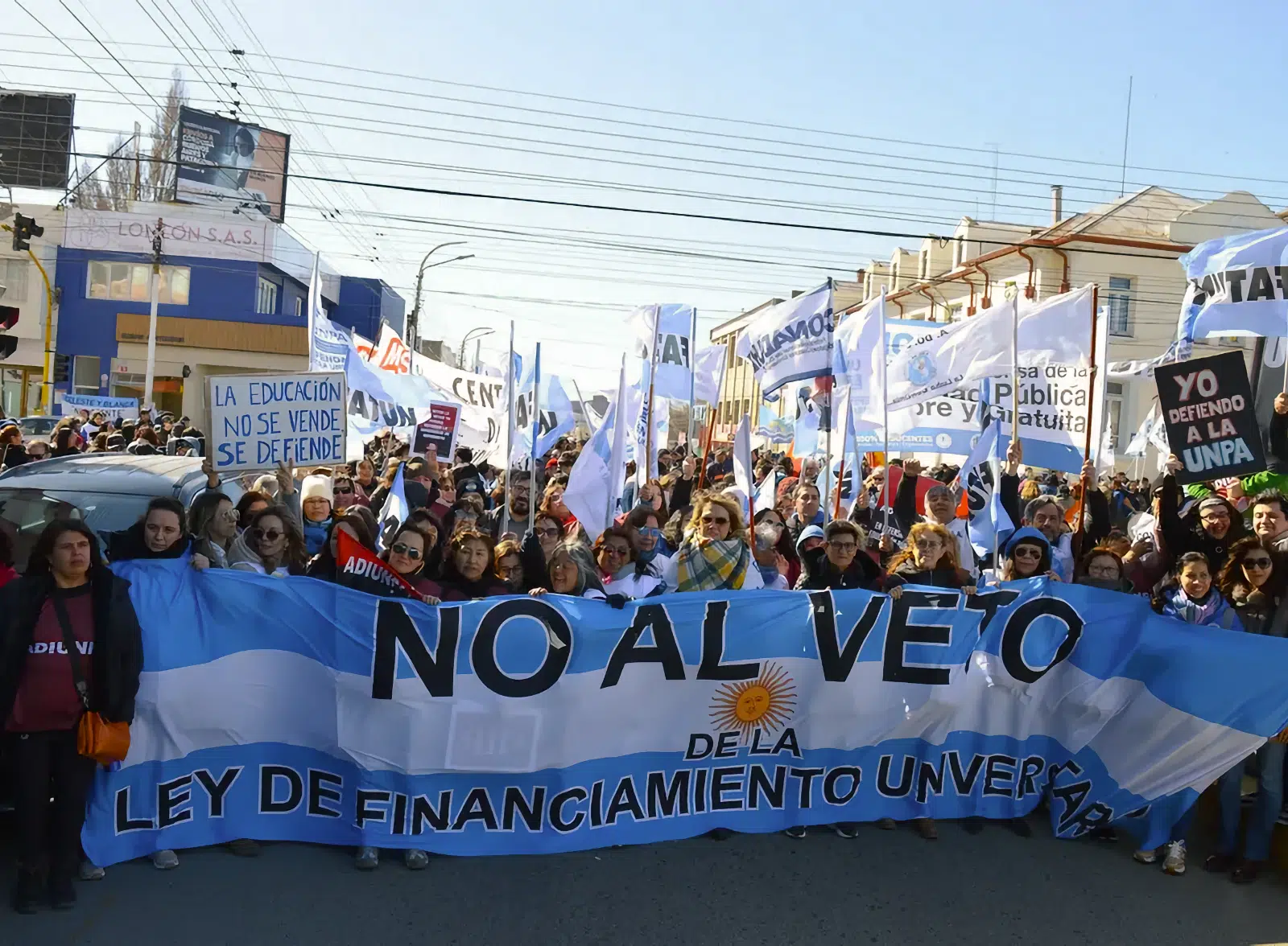 Bajo la consigna “Nuestro futuro no se veta”, diversos gremios docentes y de estatales provinciales marcharon este miércoles en Río Gallegos y Caleta Olivia en rechazo al veto del presidente Javier Milei al financiamiento universitario y en el marco de la jornada nacional de la Marcha Federal Universitaria.