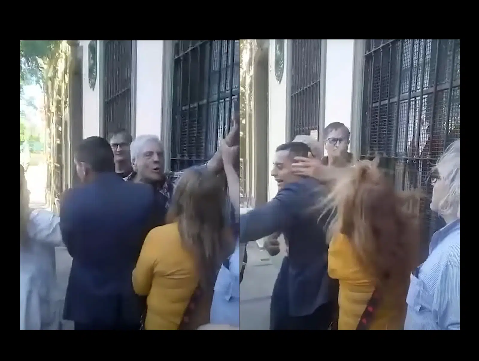 “Te voy a cagar a trompadas, andate a Cuba hija de puta“, le grita Gil en el video donde lo muestra pegándole una cachetada que le da vuelta la cara y sacude su cabello, mientras trataban de separarlo de la mujer agredida a la que le seguía gritando “La concha de tu madre, zurdo, ándate a Venezuela pelotuda, hija de puta”.